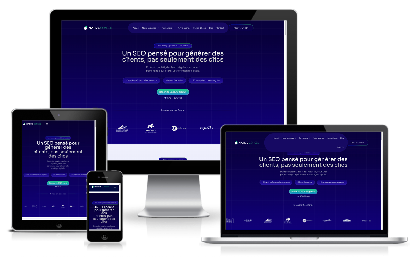 Ce projet m’a permis de travailler l’expérience utilisateur et la lisibilité du contenu, de valoriser visuellement les chiffres clés (+150 % de trafic moyen, plus de 50 entreprises accompagnées, méthodologie claire en étapes) et de faciliter l’engagement, tout en restant fidèle à l’identité et à la stratégie marketing de Native Conseil.